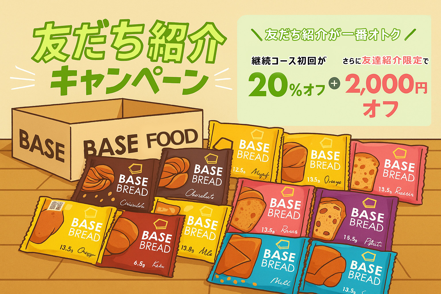 私もこの紹介制度を利用して定期便を契約しました。継続コース初回は20%OFF+2,000円OFFで、さらにおまけ(私の場合はチョコ味のBASE BREAD1つ)まで付いてきました。正直これを知らないと損です。 👉 割引付きで定期便を申し込む