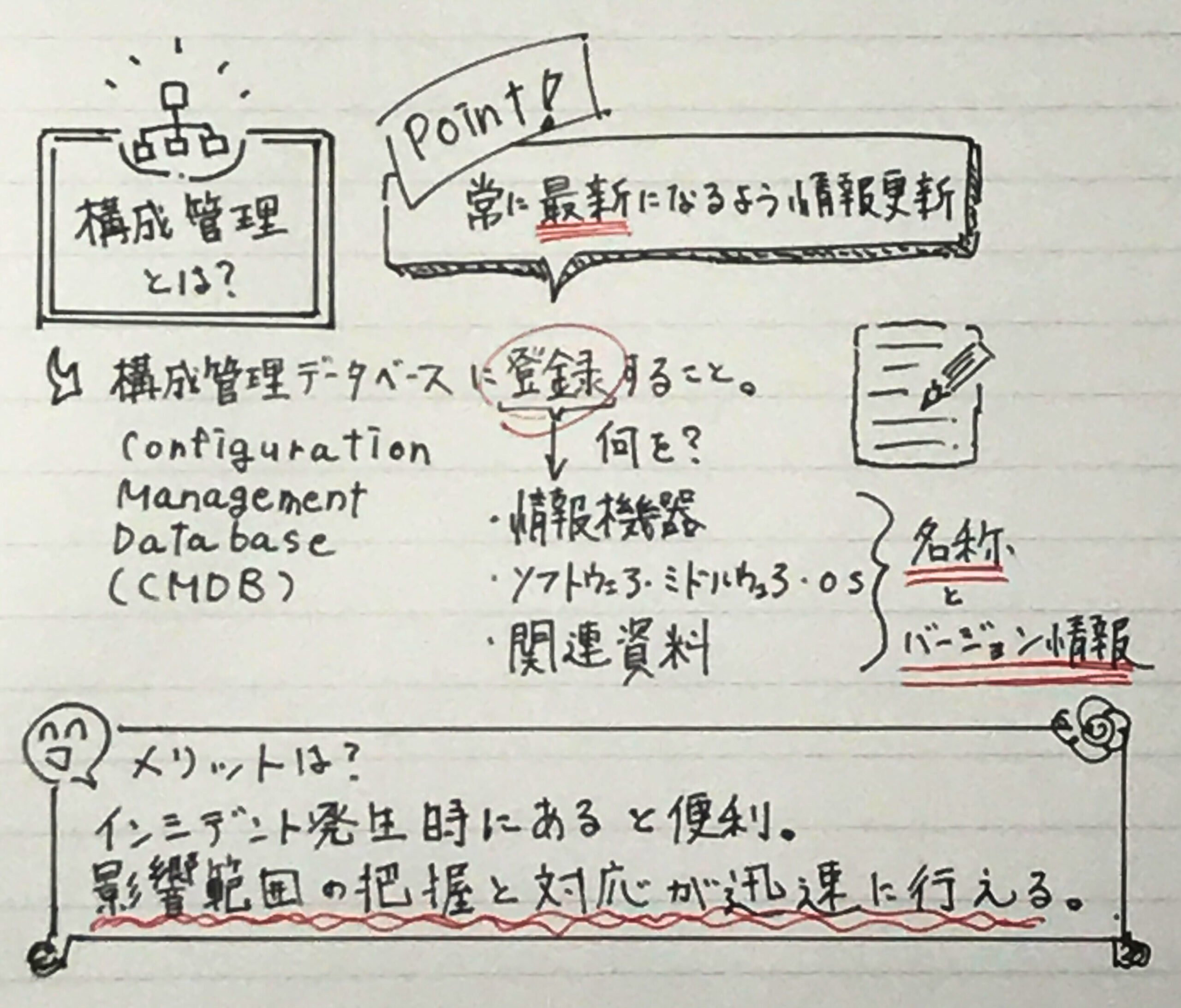 今回は、基本情報技術者試験でもよく出てくる「構成管理」について、手書きノートと一緒に解説していきます。