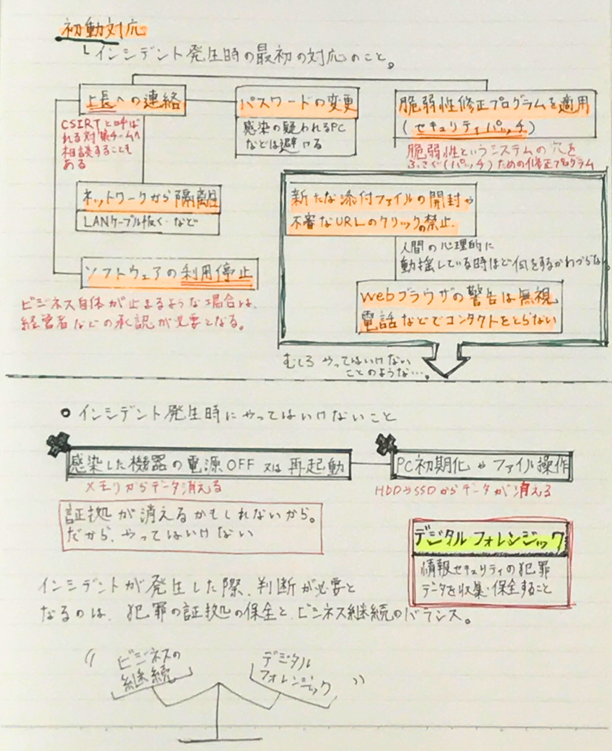 基本情報技術者試験の科目Bにおけるセキュリティ対策の中でも重要なのが、インシデント発生時の初動対応。