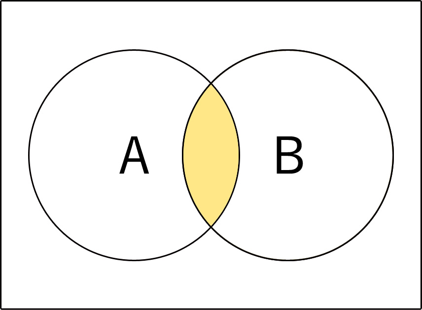 AND演算は、AとBの交わり。∩(キャップ:積集合)で表す。例:A∩B=A AND B。